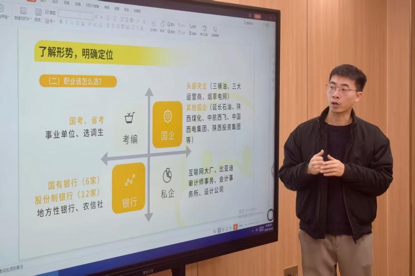 在“了解形势,明确定位”环节,聂老师结合当前就业市场趋势,深入剖析职业选择关键考量因素。同时从考编、国企、银行、私企四大职业赛道出发,进行横向对比分析,并以各省公职类考试时间轴为依托,直观呈现不同考试的时间节点与报考要点,助力学子精准把握就业节奏。