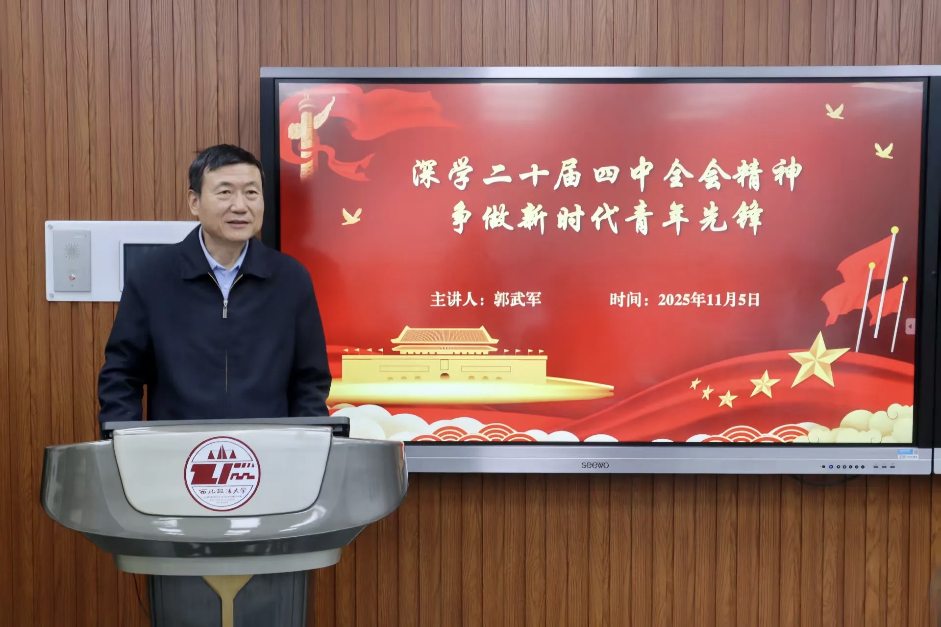 为深入学习贯彻党的二十届四中全会精神,教育引导新生筑牢思想根基、找准青春坐标,11月5日下午,校党委副书记郭武军以“深入学习贯彻党的二十届四中全会精神,争做新时代先锋青年”为题,为bat365在线登录网站注册赠送362025级新生讲授专题思政课。会议由bat365在线登录网站注册赠送36党委副书记、副院长侯颖怡主持。