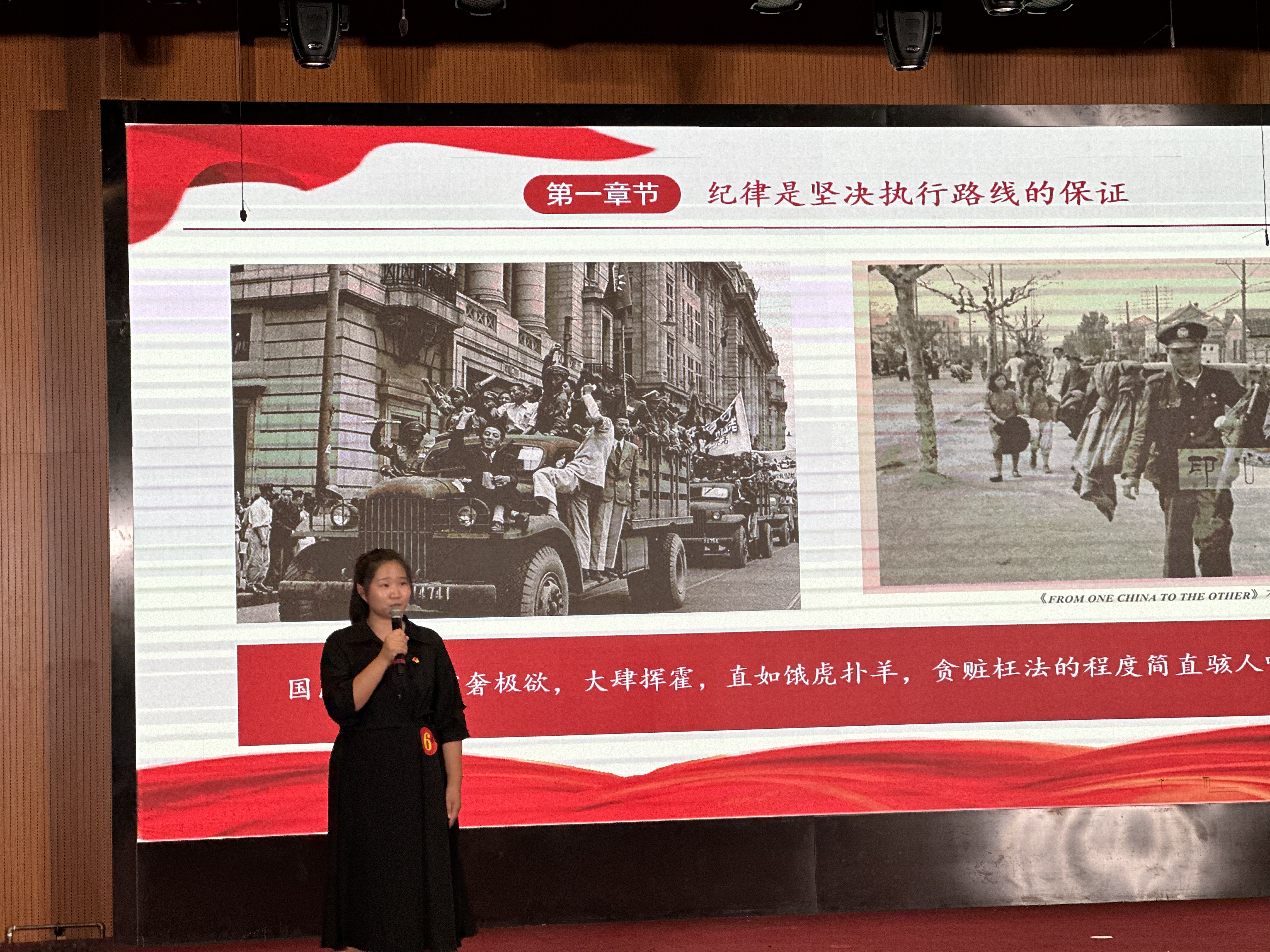 李念以《铁的纪律是党的生命线》为题,用生动的语言、鲜活的事例、饱满的情感,带领大家重温党的纪律建设历史和宝贵经验,围绕新修订的《中国共产党纪律处分条例》作全面细致解读。她讲到,勇于自我革命、从严管党治党,是我们党一脉传承、一以贯之的鲜明品格,也是我们党最大的优势。作为党员教师,要把铁的纪律内化为政治、思想和行动自觉,坚决做到心有所戒,慎始慎终,以律己之心昂扬奋进之态,用高尚品格担当育人使命,努力在平凡岗位创造非凡业绩。