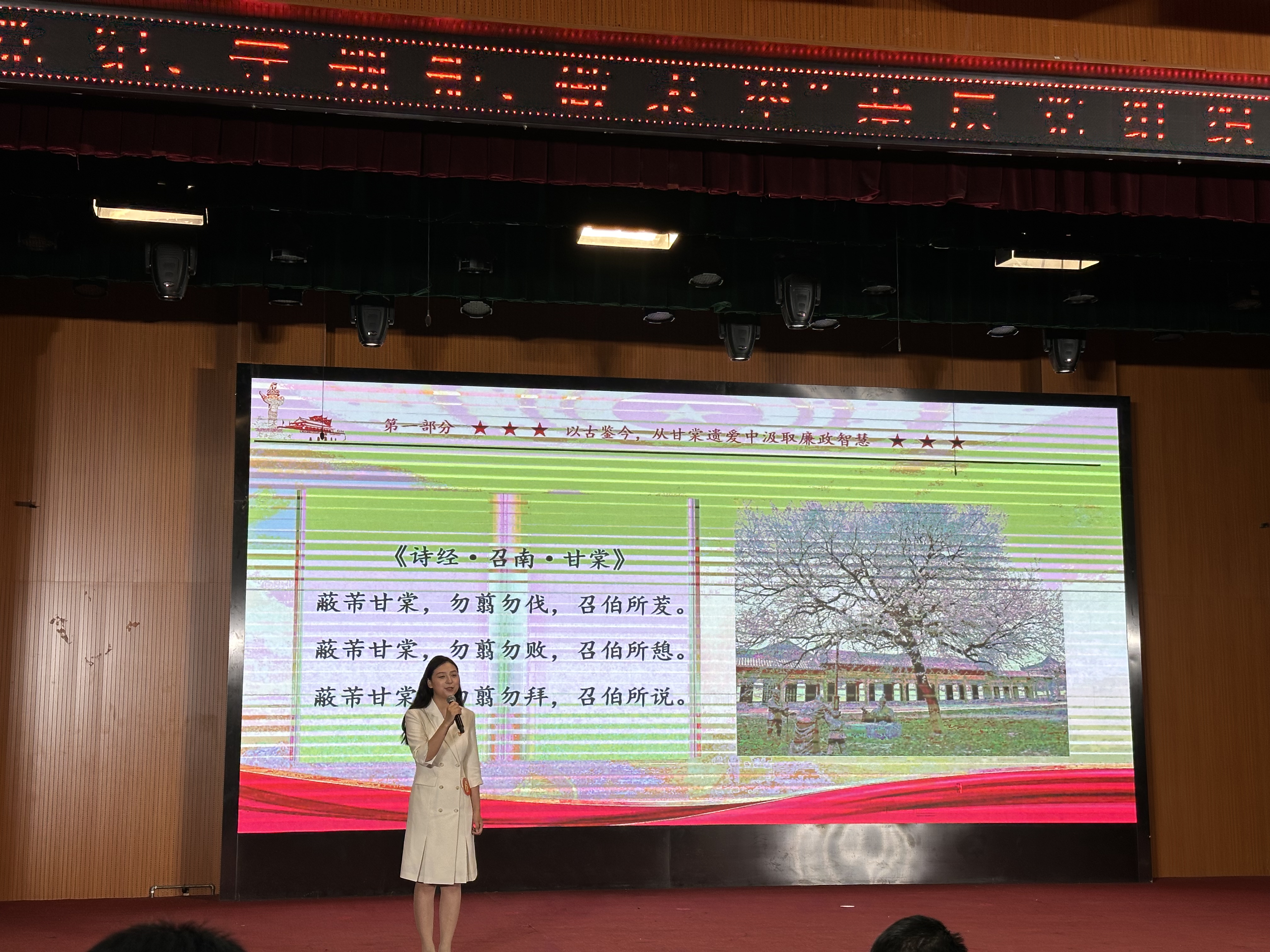 何晓岭以《守好廉洁纪律,永葆清廉本色》为题,结合《诗经》典故和典型案例展开讲述,以小见大,寓理于情,发人深省。她讲到,要从中华优秀传统文化中汲取廉洁智慧,原原本本、逐章逐条学习《中国共产党纪律处分条例》,强化纪律意识、加强自我约束、提高免疫能力、守好廉洁底线,发挥青年党员先锋模范作用。