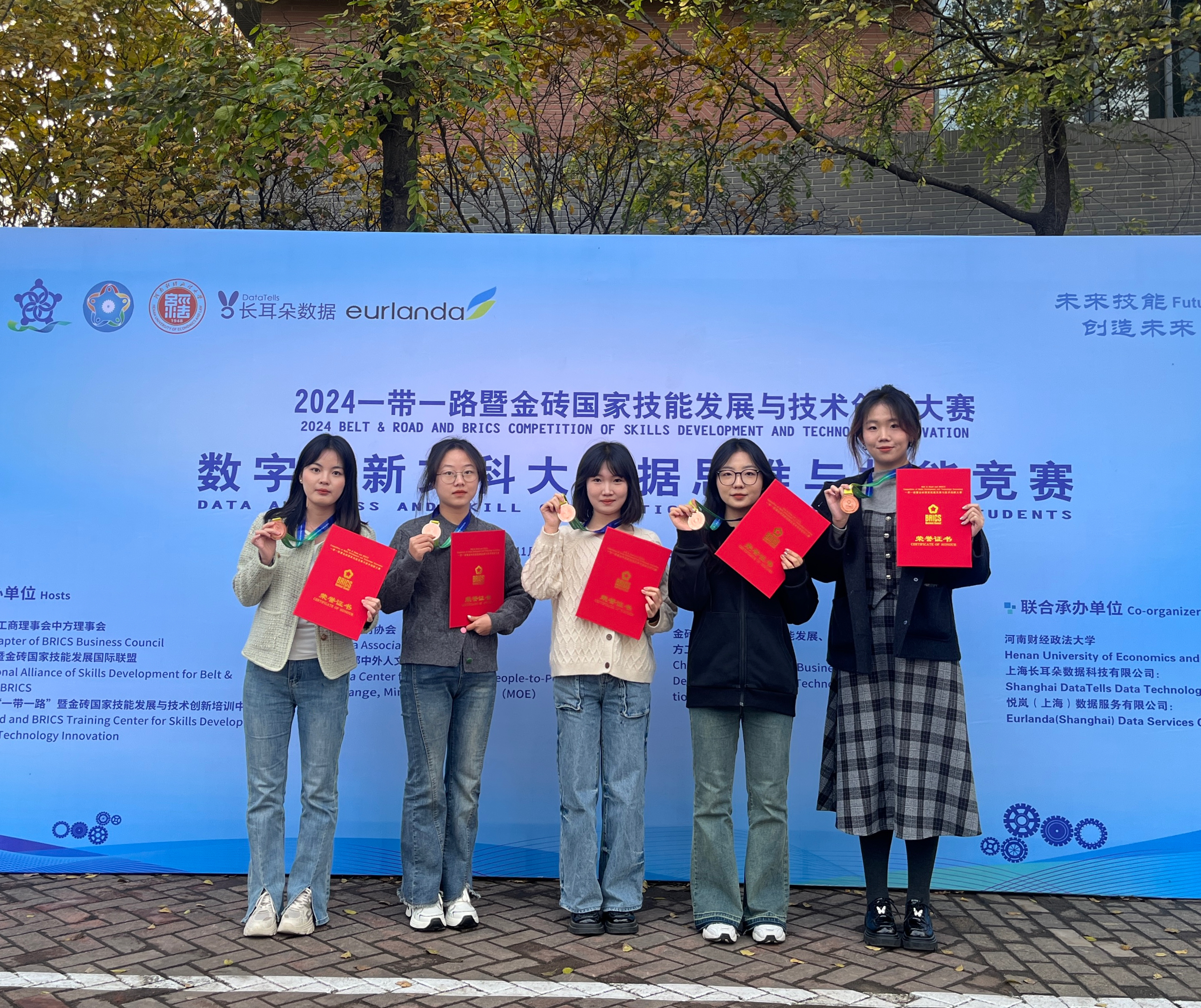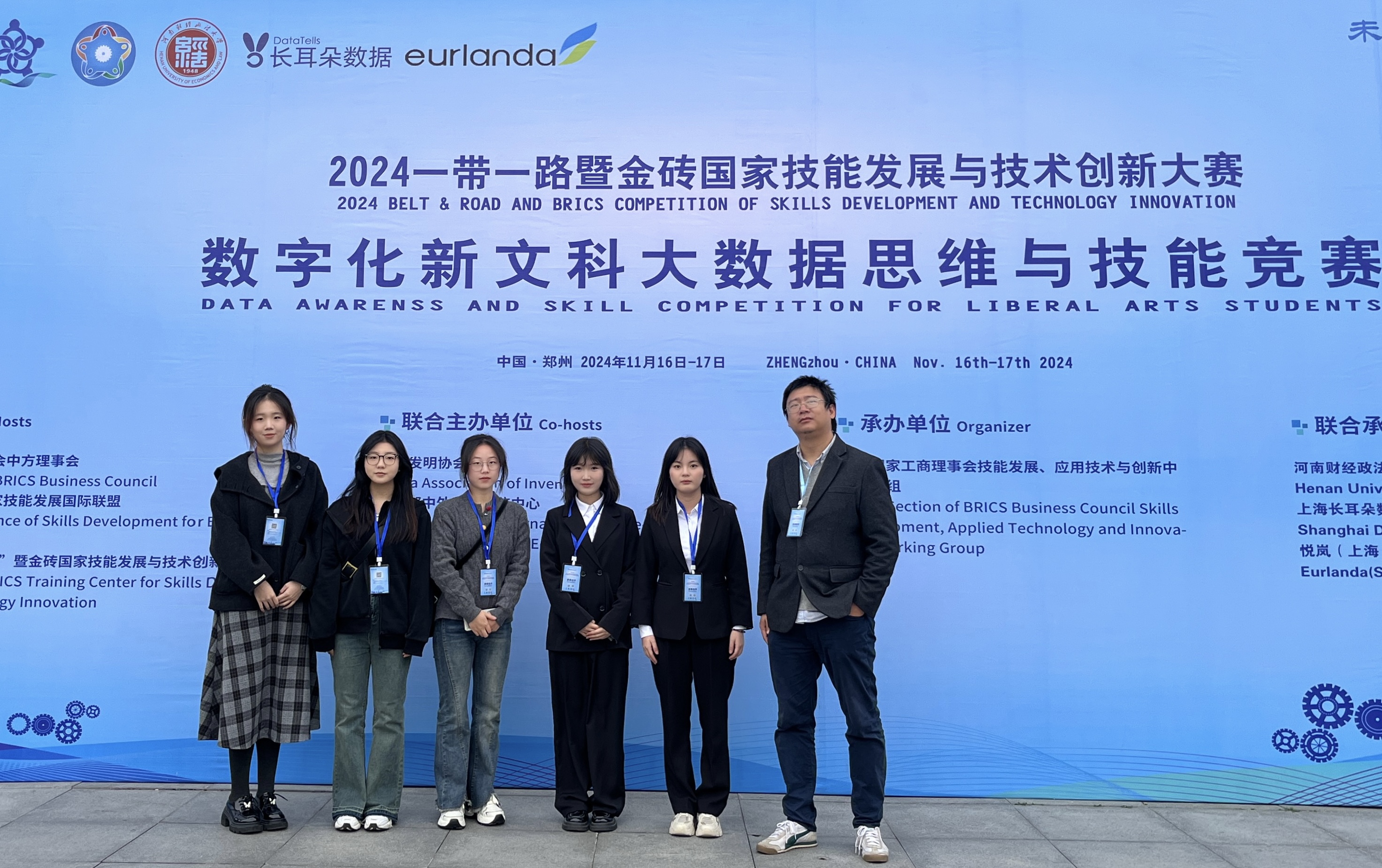 11月16—17日,国际级A类赛事,2024第八届一带一路暨金砖国家技能发展与技术创新大赛——第二届数字化新文科大数据思维与技能赛项决赛在河南财经政法大学举办。由我校bat365在线登录网站注册赠送36张鹏老师指导的,来自bat365在线登录网站注册赠送36的袁熙睿、马冰瑞、范煊梓、曹培杉、王天然等五位学生组成的队伍荣获国赛三等奖。