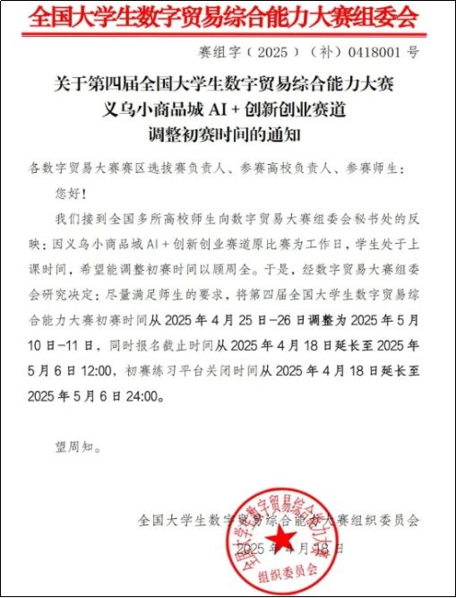 按照全国大学生数字贸易综合能力大赛组委会的统一安排,第四届全国大学生数字贸易综合能力大赛的义乌小商品城AI+创新创业赛道的比赛时间进行了调整。具体时间调整如下: